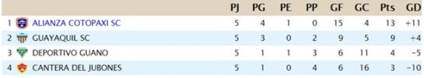 Alianza Cotopaxi logra sumar 13 unidades y Guayaquil S.C, segundo en la tabla se quedó con 9 puntos y queda una sola fecha por jugarse.