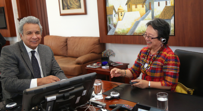 El presidente de la República, Lenín Moreno, recibió este miércoles a la relatora sobre los Derechos de los Pueblos Indígenas, de la oficina de los Derechos Humanos de las Naciones Unidas, Victoria Tauli-Corpuz, quien visita el país para observar los avances con relación al ejercicio y respeto de los derechos de los pueblos y nacionalidades indígenas en Ecuador.