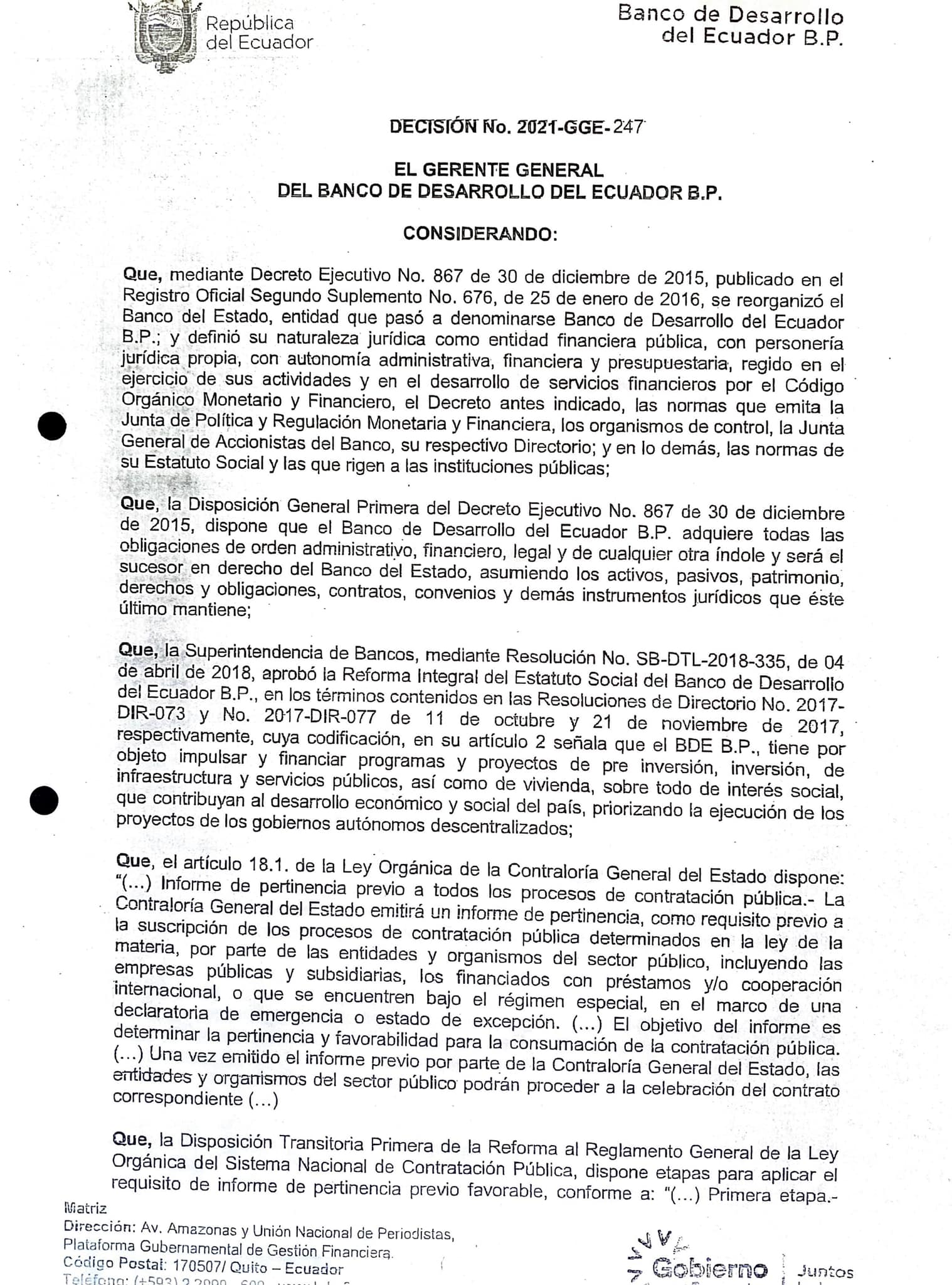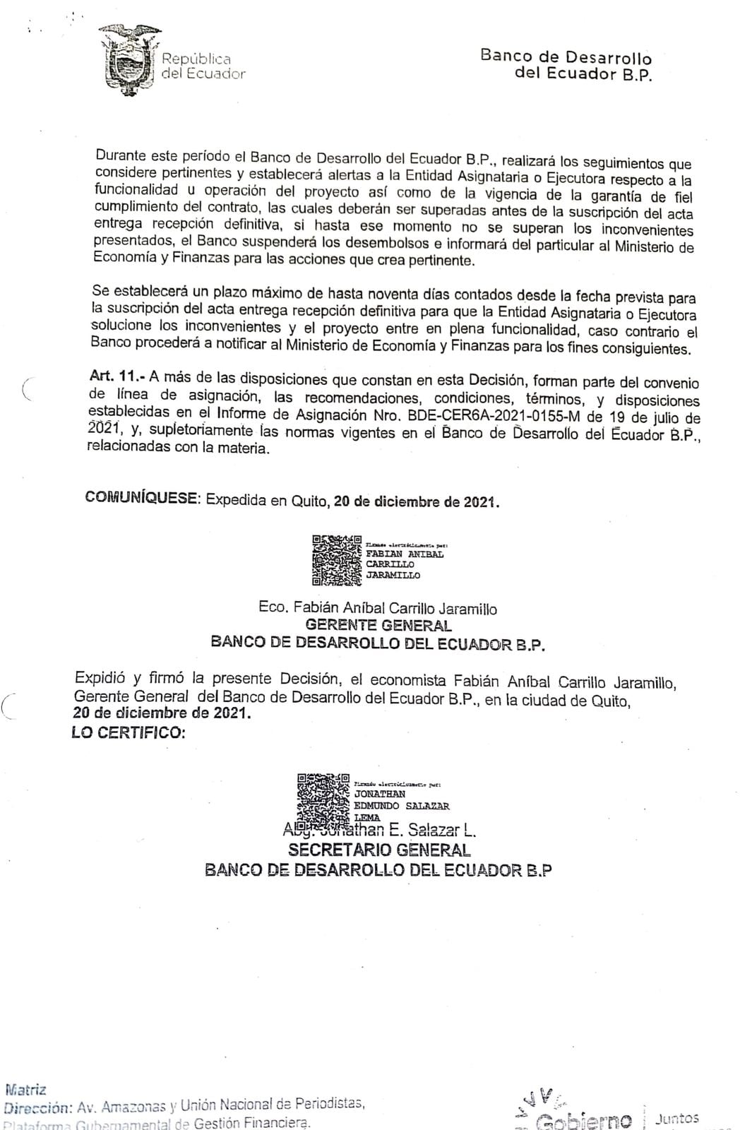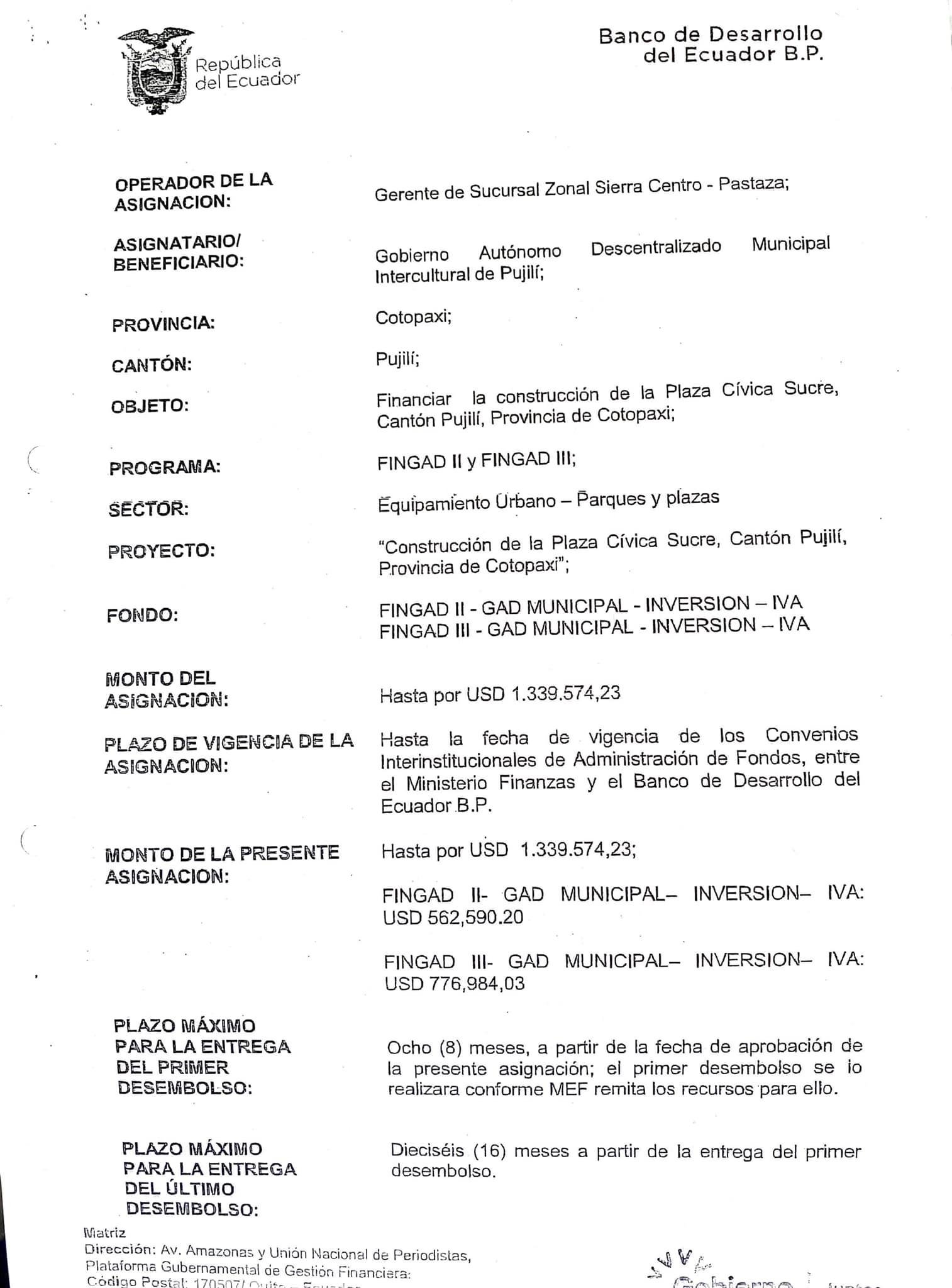 Con un monto de 1’339.574,23 dólares, mismos que fueron aprobados por parte del Banco del Estado el pasado 20 de diciembre del 2021, con resolución N. 2021-GGE-247, permite tener “luz verde” para la construcción de la Plaza Cultural y Cívica Sucre.