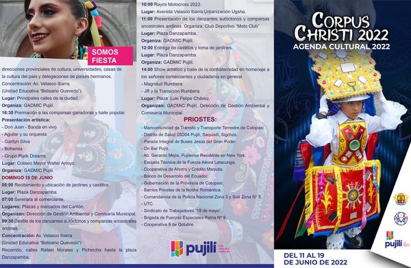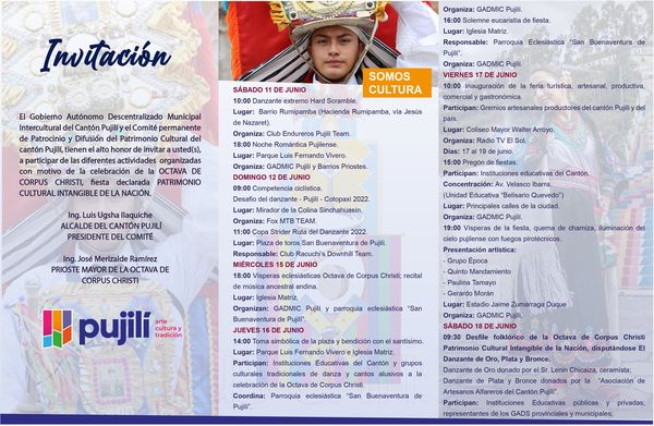 El GAD Municipal intercultural del Cantón Pujilí, invita a propios y extraños a ser partícipes de la Agenda Cultural de la Octava de Corpus Christi 2022 a efectuarse del 11 al 19 de junio.