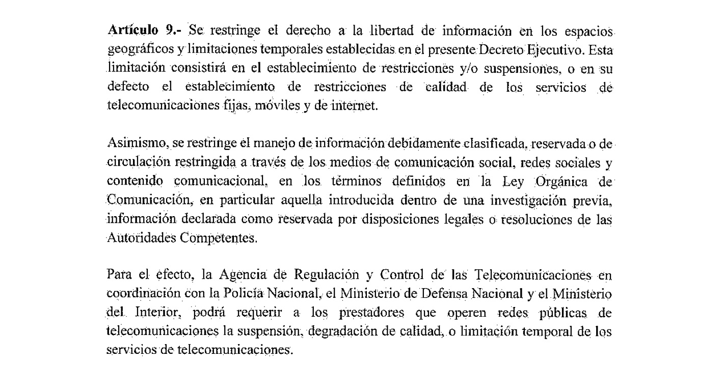 La reacción por parte de la prensa de Cotopaxi y el país, fue inmediata al ver que se limita el trabajo de información, Alejandro Fabara ex Jefe Político y actual Director Nacional de Articulación Política en el Ministerio de Gobierno, confirmó que luego de tomar contacto con el Secretario Jurídico de la Presidencia de la República, Fabián Pozo, el artículo 9 en mención no va en el Decreto Presidencial y será eliminado.
