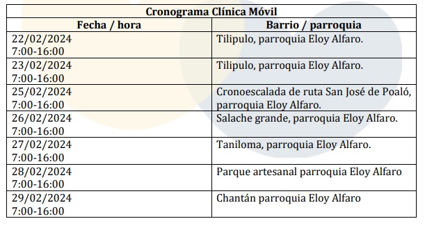 De acuerdo a la planificación, la Clínica Móvil llegará a varios sectores de la parroquia Eloy Alfaro en lo que corresponde al mes de febrero.